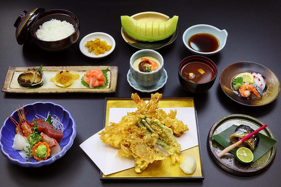 | 13,310円 | 竹コース | 前菜・お刺身・酢の物・焼き物・茶碗蒸し ・天ぷら(えび×3・野菜×2)・ご飯・なめこ汁・お新香・季節の果物 |