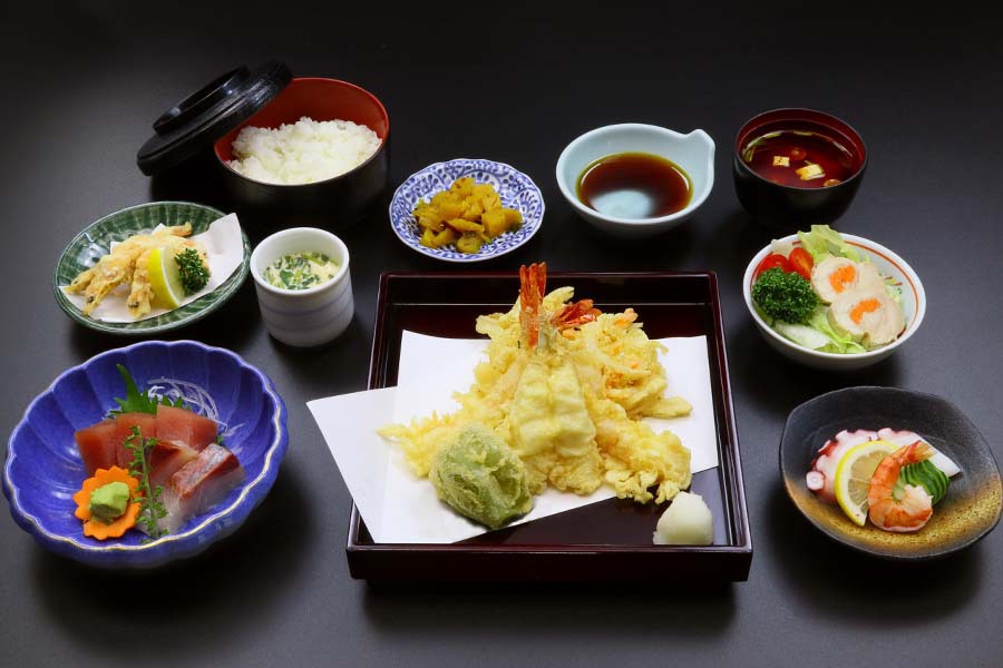 | 基 本 | 【えび×1・野菜かき揚×1・魚×1・野菜×1・ご飯・味噌汁・香の物】 |