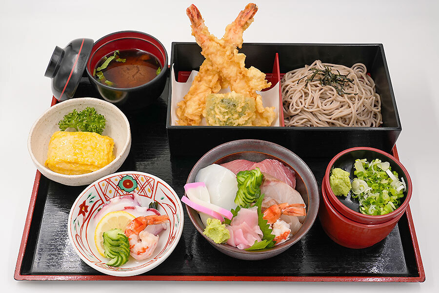 Seafood bowl / Tempura soba / Omelette / Vinegared dish / Nameko soup