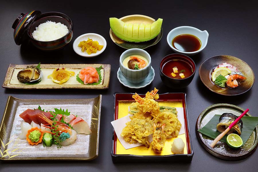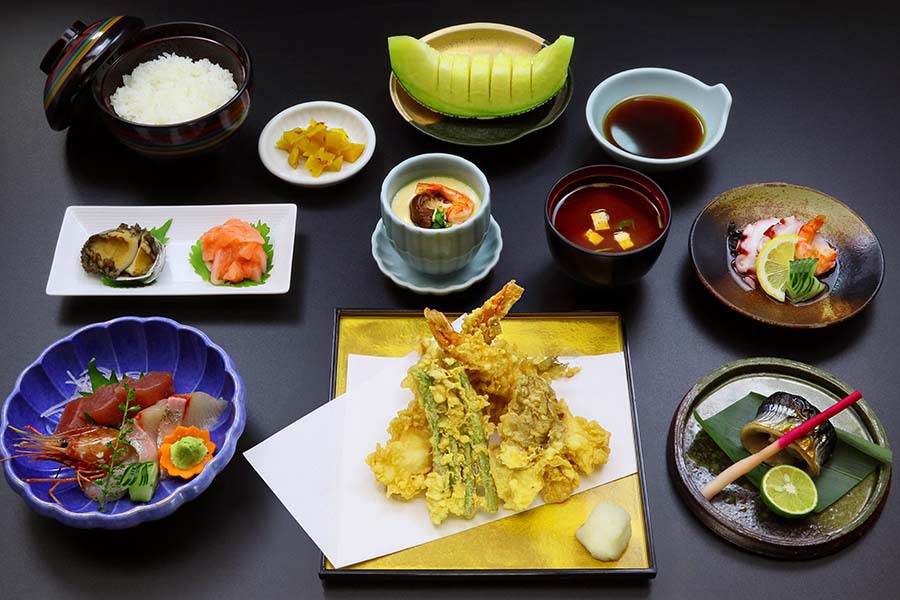 | 13,310円 | 竹コース | 前菜・お刺身・酢の物・焼き物・茶碗蒸し ・天ぷら(えび×3・野菜×2)・ご飯・なめこ汁・お新香・季節の果物 |